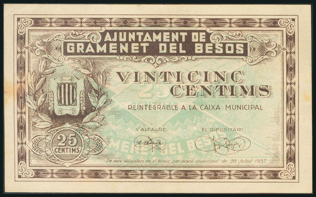 GRAMANET DE BESOS (BARCELONA). 25 Céntimos. 30 de Julio de 1937. (González: 8076). MBC.