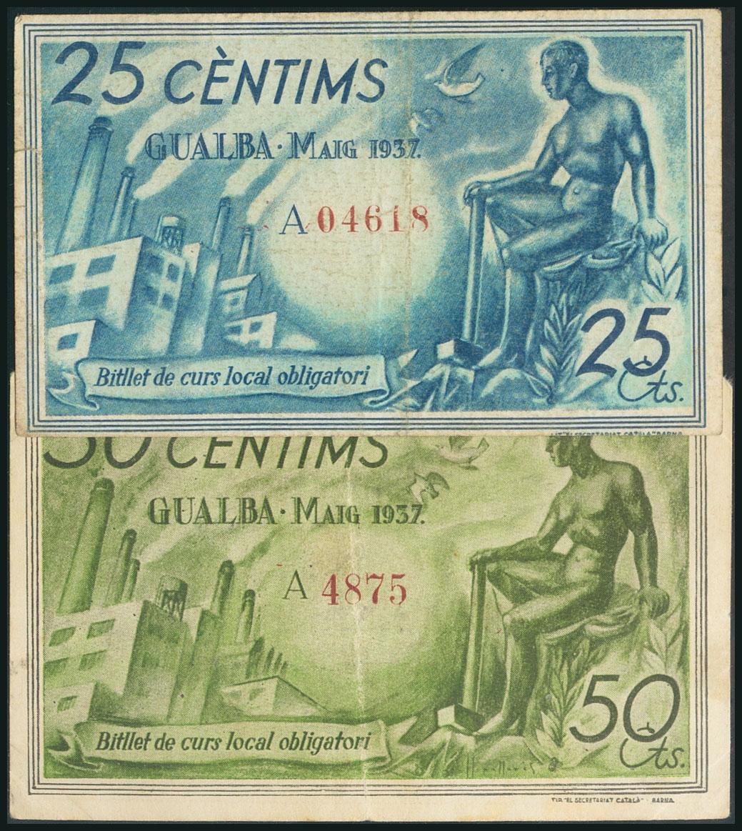 GUALBA (BARCELONA). 25 Céntimos y 50 Céntimos. Mayo 1937. Serie A, ambos. (González: 8139/40). Serie completa. MBC.