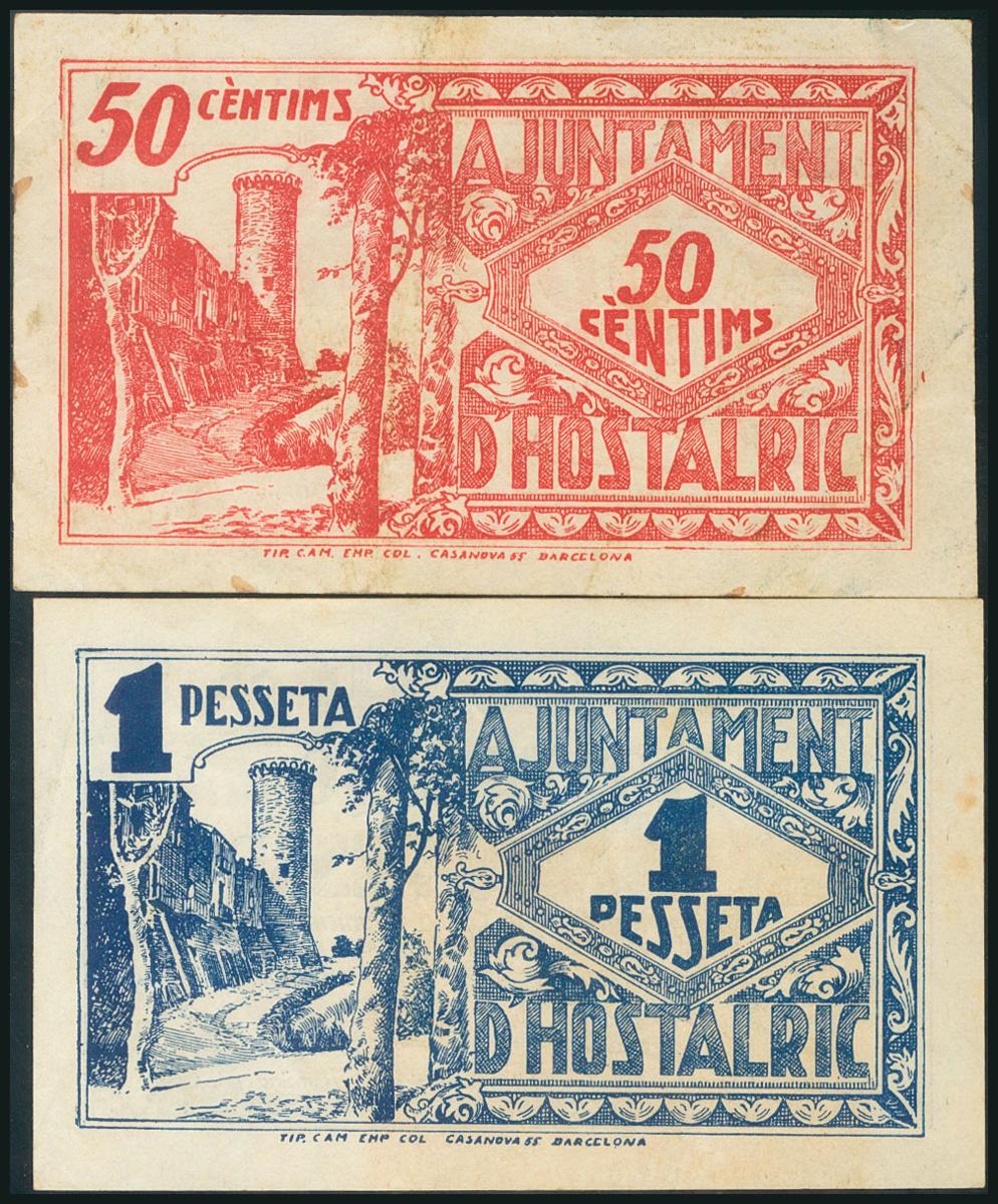 HOSTALRIC (GERONA). 50 Céntimos y 1 Peseta. 1 de Junio 1937. (González: 8232/33). Serie completa. MBC+.
