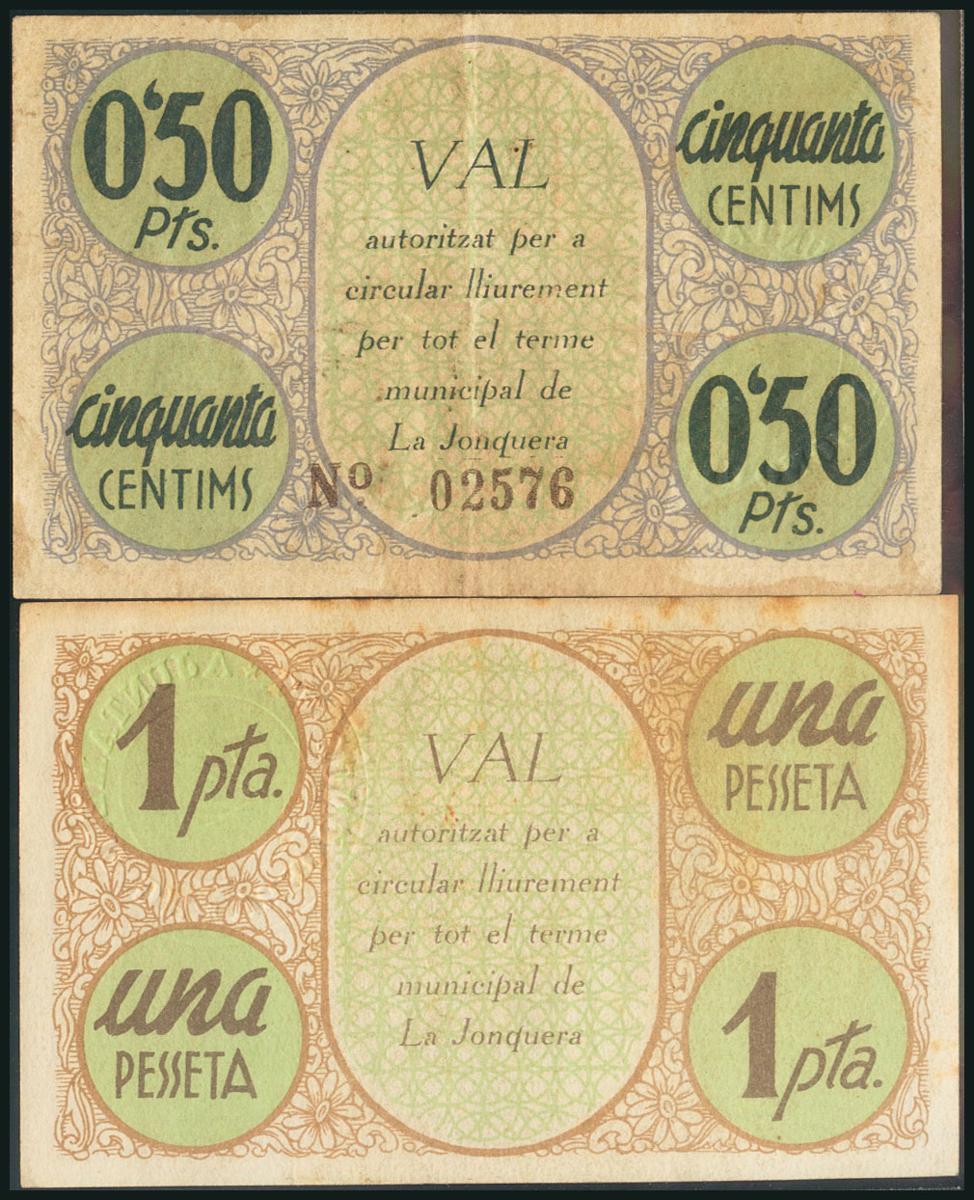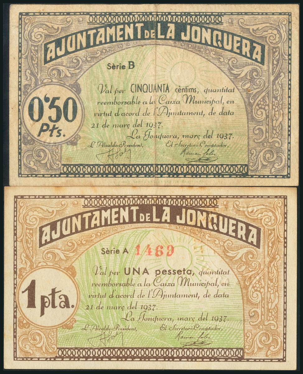 LA JONQUERA (GERONA). 50 Céntimos y 1 Peseta. 21 de Marzo de 1937. Serie B y A, respectivamente. (González: 8276, 8278). MBC+.