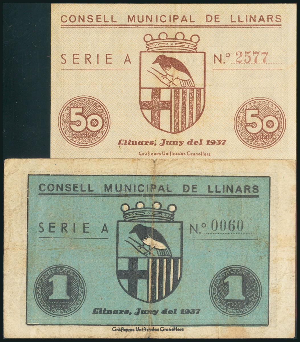 LLINARS DEL VALLES (BARCELONA). 50 Céntimos y 1 Peseta. Junio 1937. (González: 8405/06). Serie completa. MBC/BC-.