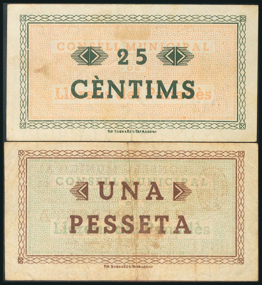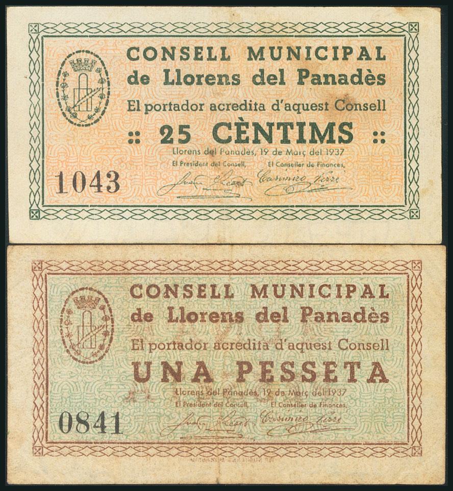 LLORENS DEL PANADES (TARRAGONA). 25 Céntimos y 1 Peseta. Marzo 1937. (González: 8429/30). Inusual serie completa. EBC/MBC.