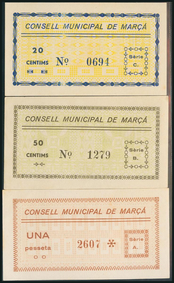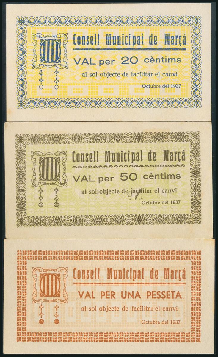MARÇA (TARRAGONA). 25 Céntimos, 50 Céntimos y 1 Peseta. Octubre 1937. Series C, B y A, respectivamente. (González: 8558/60). Rara serie completa. EBC+.
