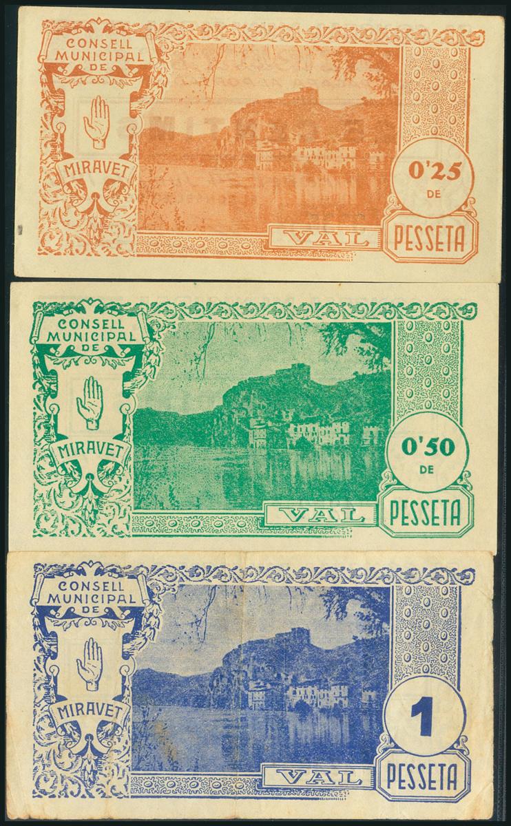 MIRAVET (TARRAGONA). 25 Céntimos, 50 Céntimos y 1 Peseta. 24 de Junio de 1937. Series C, B y A, respectivamente. (González: 8684/86). Muy rara serie completa. EBC/MBC-.