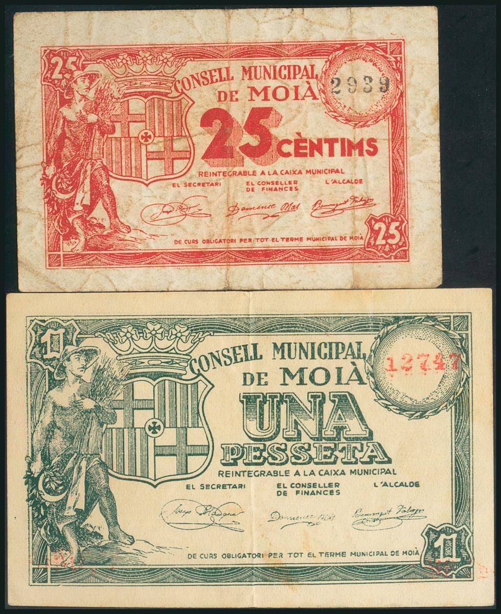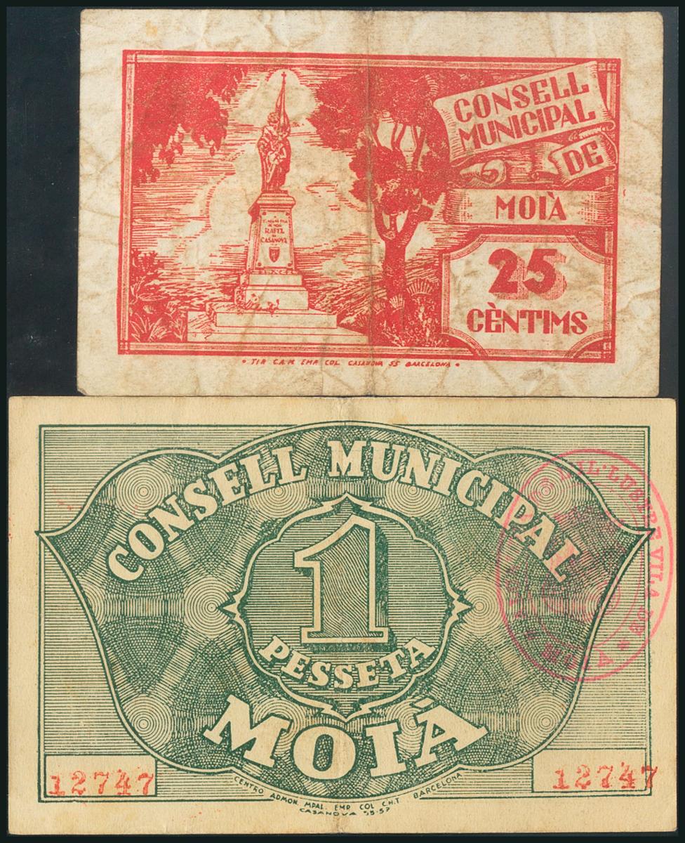 MOIA (BARCELONA). 25 Céntimos y 1 Peseta. (1938ca). (González: 8689/90). BC/MBC+.