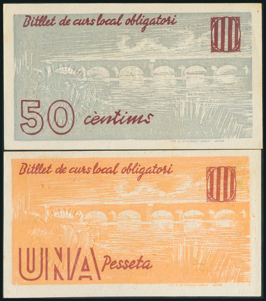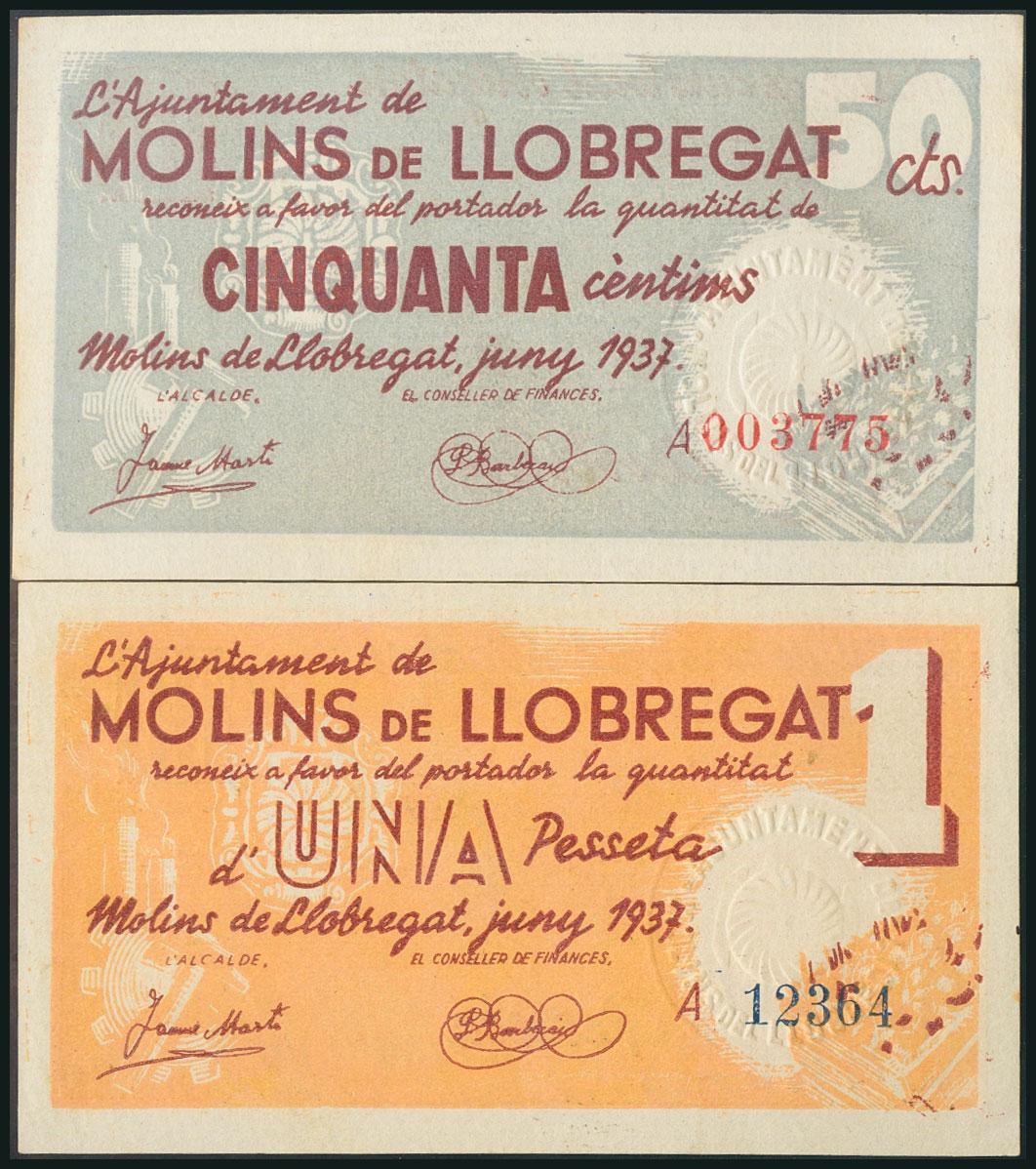 MOLINS DE LLOBREGAT (BARCELONA). 50 Céntimos y 1 Peseta. Serie A, ambos. (González: 8699/00). Preciosa serie completa. SC-.