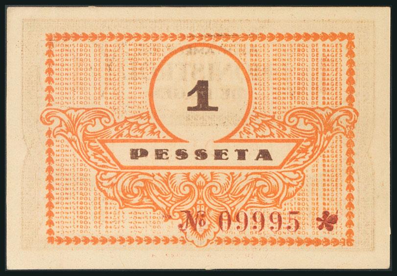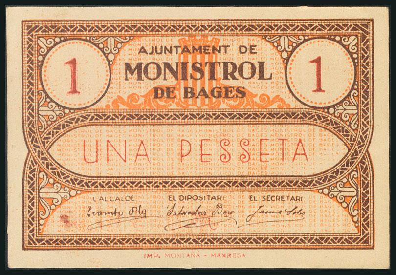 MONISTROL DE BAGES (BARCELONA). 1 Peseta. (1937ca). (González: 8725). Raro. SC.