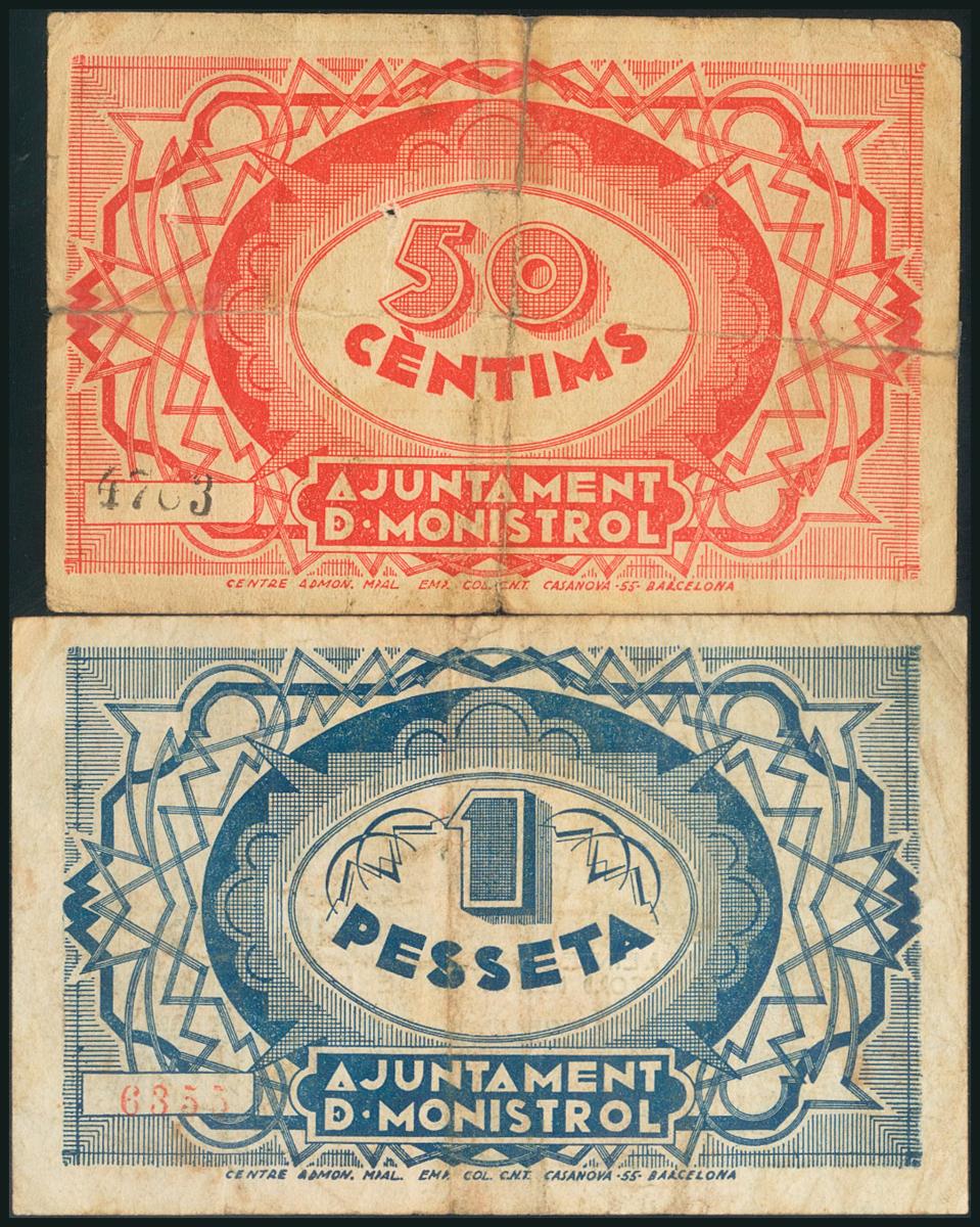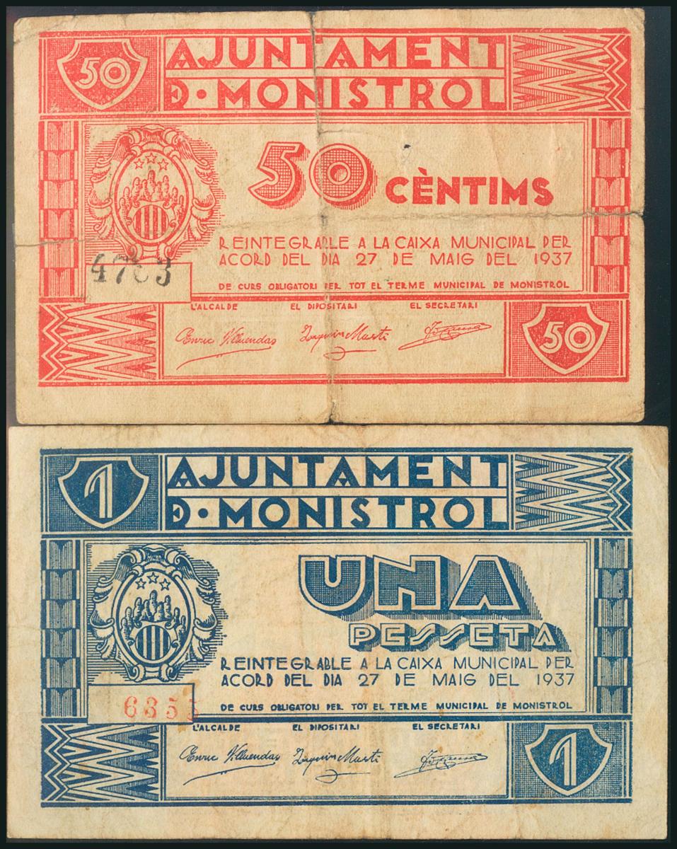 MONISTROL (BARCELONA). 50 Céntimos y 1 Peseta. 27 de Mayo de 1937. (González: 8726/27). Serie completa. BC/MBC.