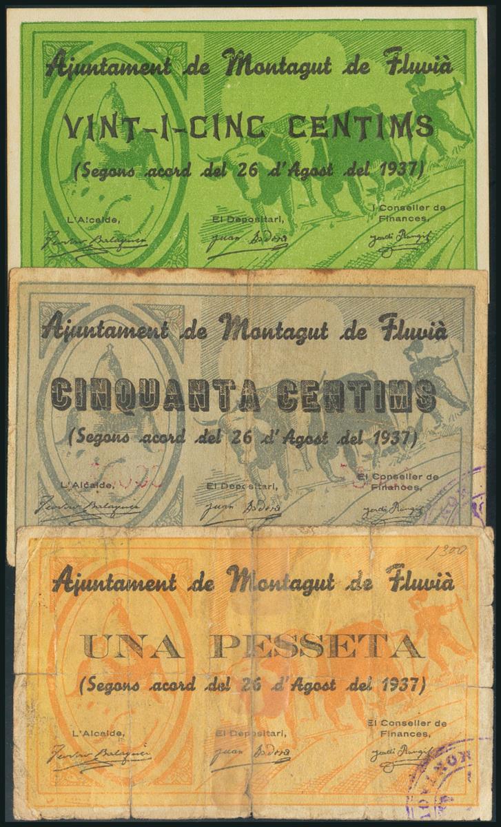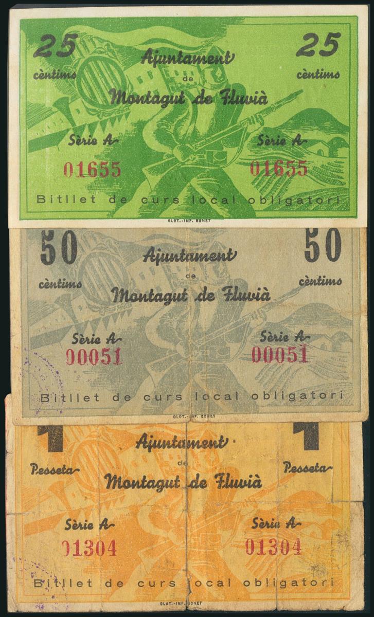 MONTAGUT DE FLUVIA (GERONA). 25 Céntimos, 50 Céntimos y 1 Peseta. 26 de Agosto de 1937. Serie A, los tres. (González: 8738/40). Rara serie completa. SC/RC.
