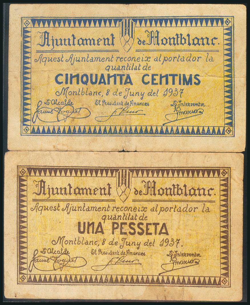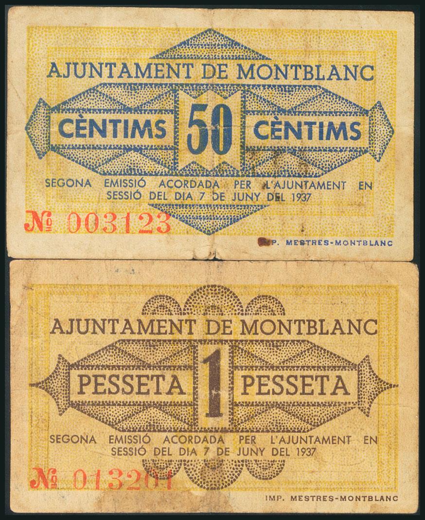 MONTBLANC (TARRAGONA). 50 Céntimos y 1 Peseta. 8 de Junio de 1937. (González: 8749/50). Serie completa. MBC.