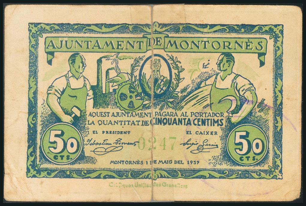 MONTORNES (BARCELONA). 50 Céntimos. (1937ca). (González: 8808). Inusual y presencia de cinta adhesiva uniendo completamente el billete. RC-.