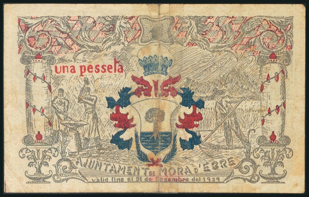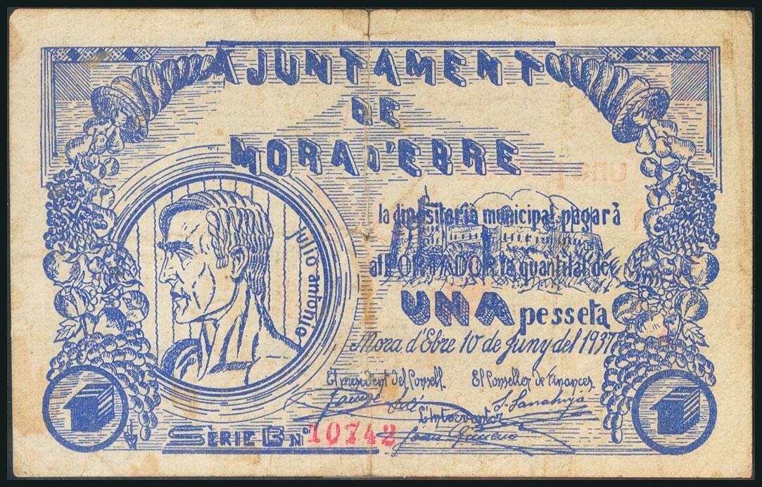 MORA D´EBRE (TARRAGONA). 1 Peseta. 10 de Junio de 1937. Serie B. (González: 8837). Presencia de cinta adhesiva. RC.