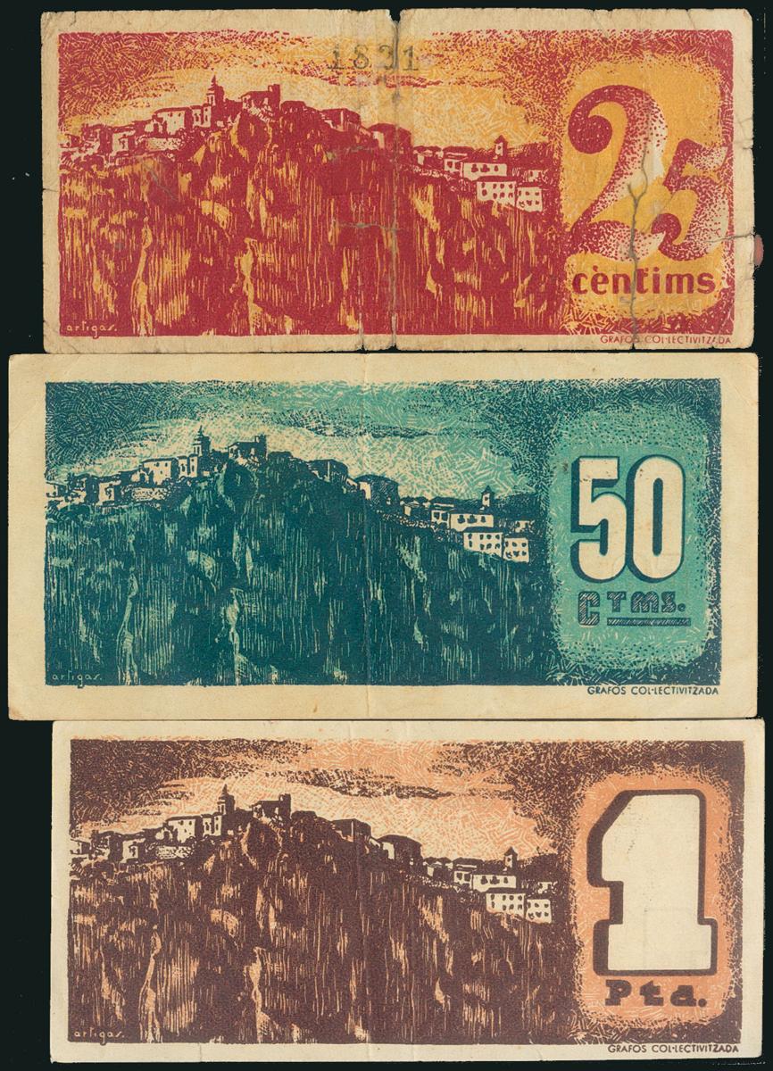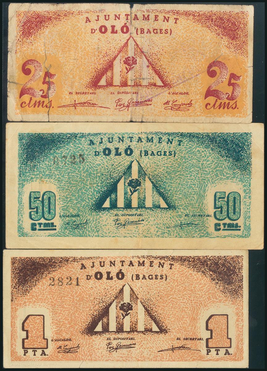 OLO (BARCELONA). 25 Céntimos, 50 Céntimos y 1 Peseta. (1937ca). (González: 8945/47). Inusual serie completa. RC/MBC+.