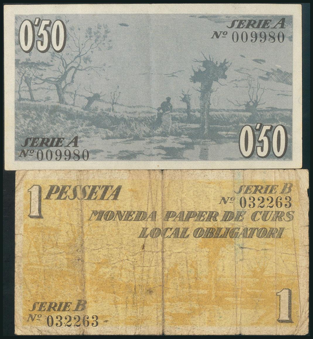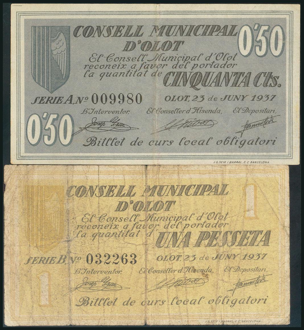 OLOT (GERONA). 50 Céntimos y 1 Peseta. 23 de Junio de 1937. Series A y B, respectivamente. (González: 8952/53). Serie completa. BC+/MBC+.
