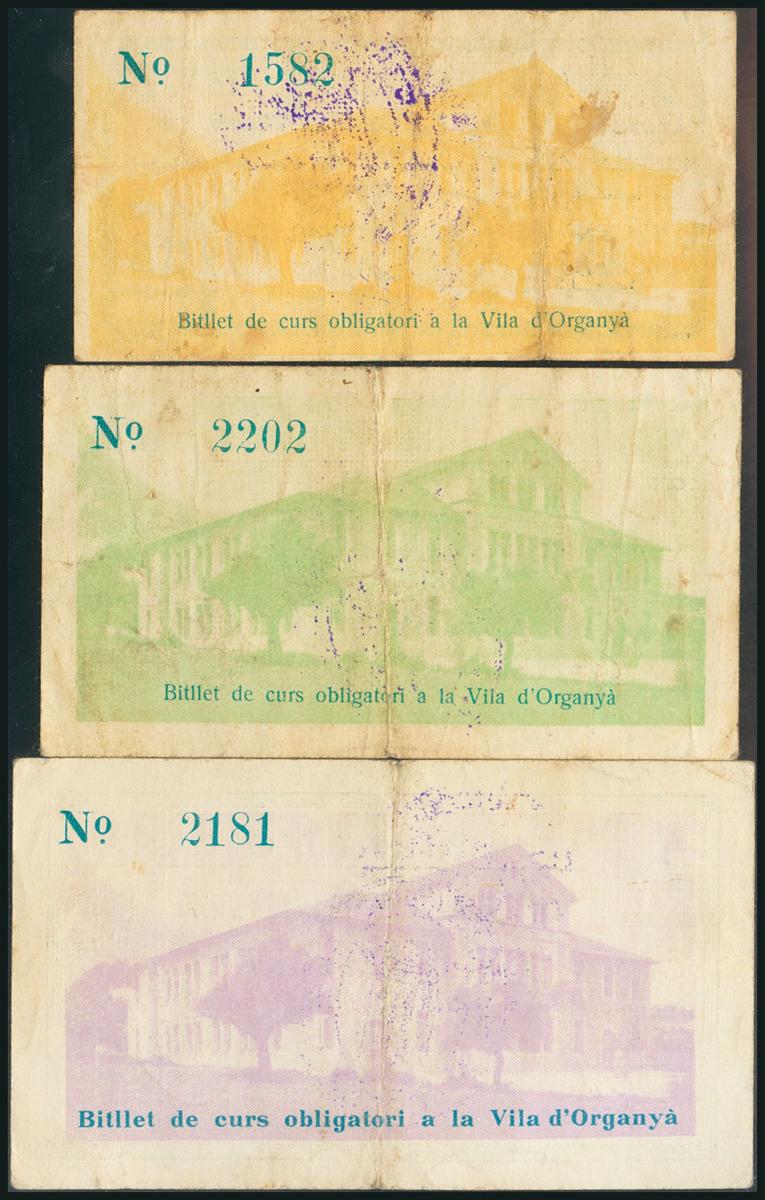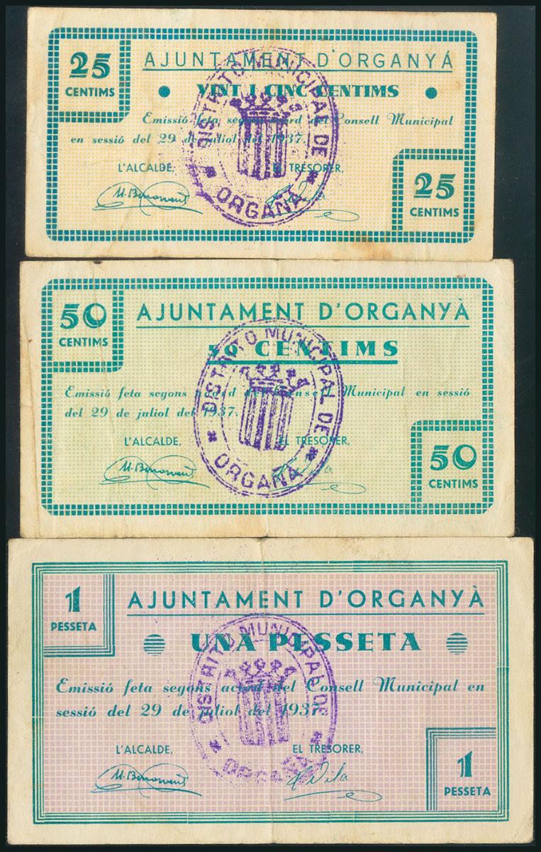 ORGANYA (LERIDA). 25 Céntimos, 50 Céntimos y 1 Peseta. 29 de Julio de 1937. (González: 9043/45). Muy rara serie completa. MBC.