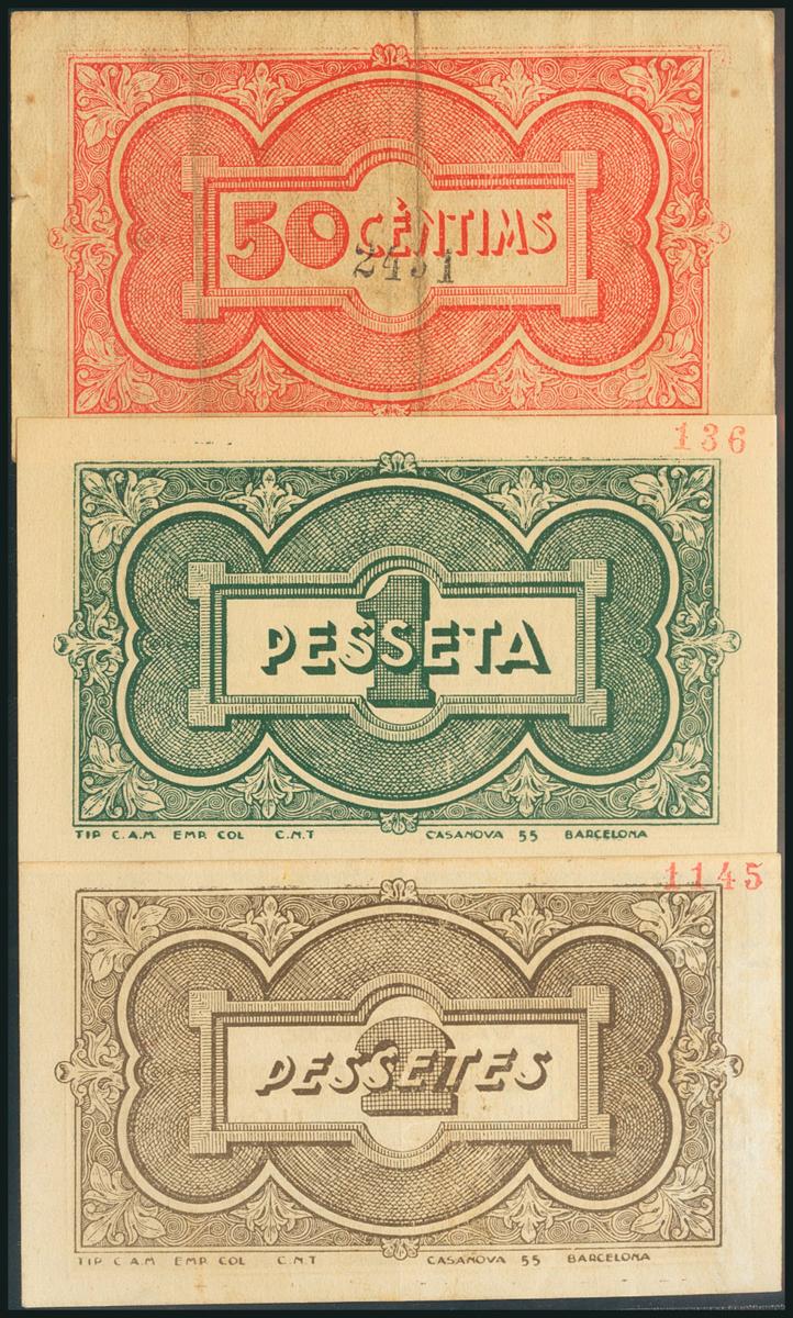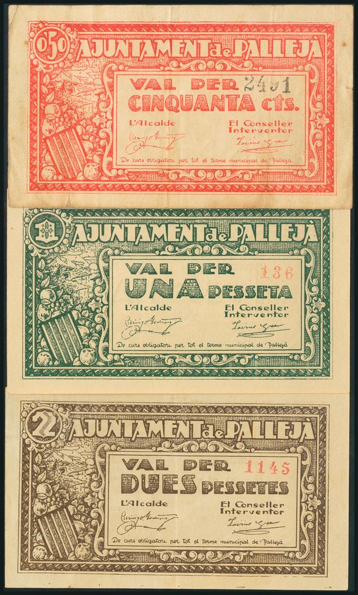 PALLEJA (BARCELONA). 50 Céntimos, 1 Peseta y 2 Pesetas. (1938ca). (González: 9134/36). Rara serie completa. MBC.