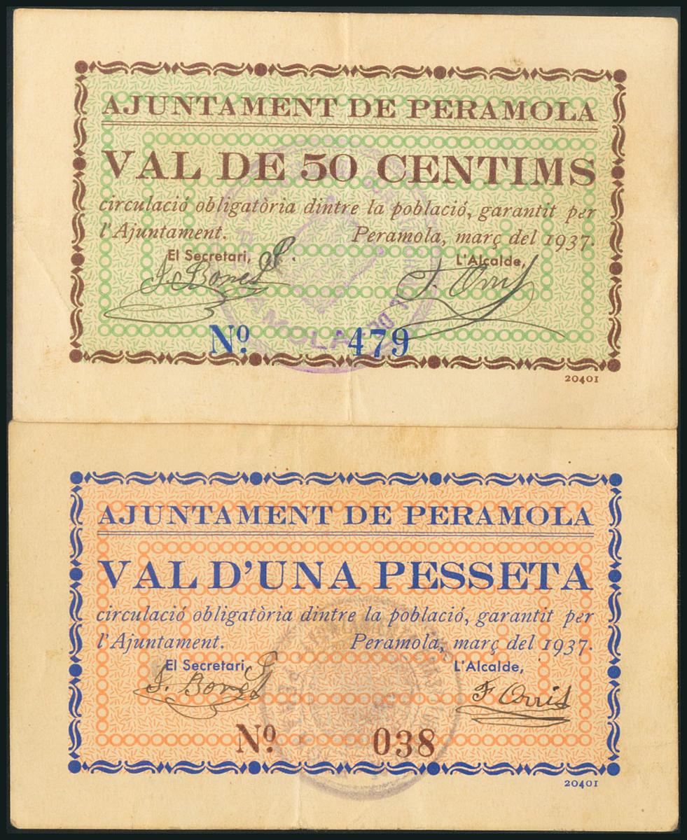 PERAMOLA (LERIDA). 50 Céntimos y 1 Peseta. Marzo 1937. (González: 9195/96). Rarísima serie completa. MBC+.