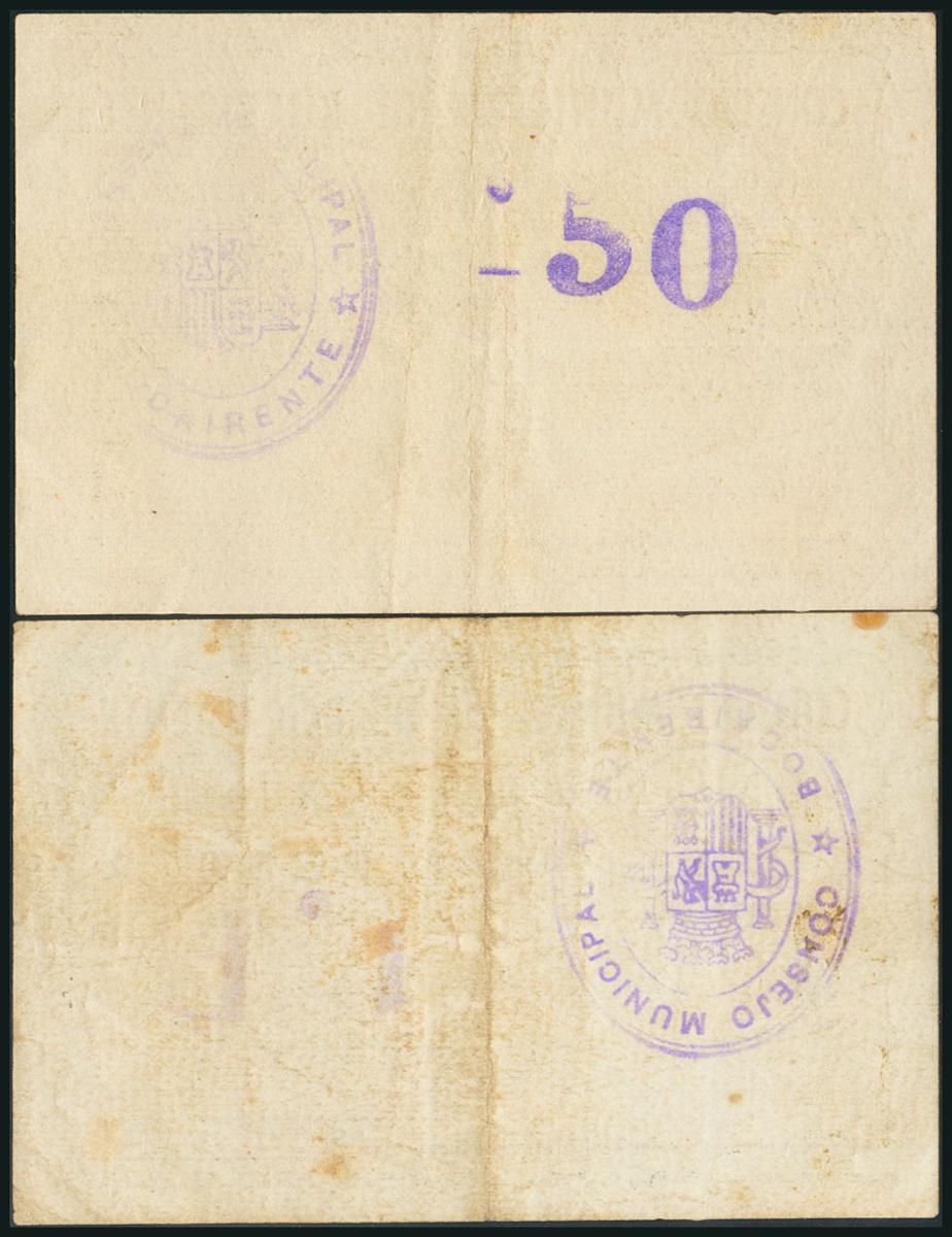 BOCAIRENTE (VALENCIA). 50 Céntimos y 1 Peseta. (1937ca). (González: 1253, 1254). Raros. MBC+.
