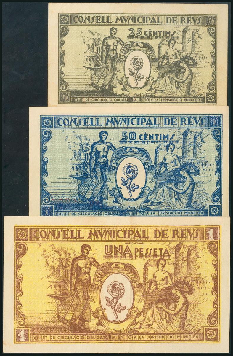 REUS (TARRAGONA). 25 Céntimos, 50 Céntimos y 1 Peseta. 14 de Abril de 1937. Series C (2) y D, respectivamente. (González: 9550, 9557, 9562). SC/EBC-.