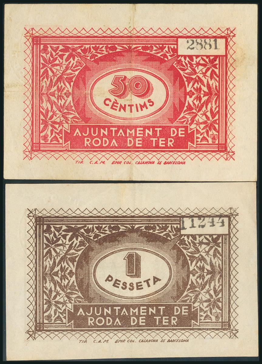 RODA DE TER (BARCELONA). 50 Céntimos y 1 Peseta. Junio 1937. (González: 9719/20). Serie completa. EBC.
