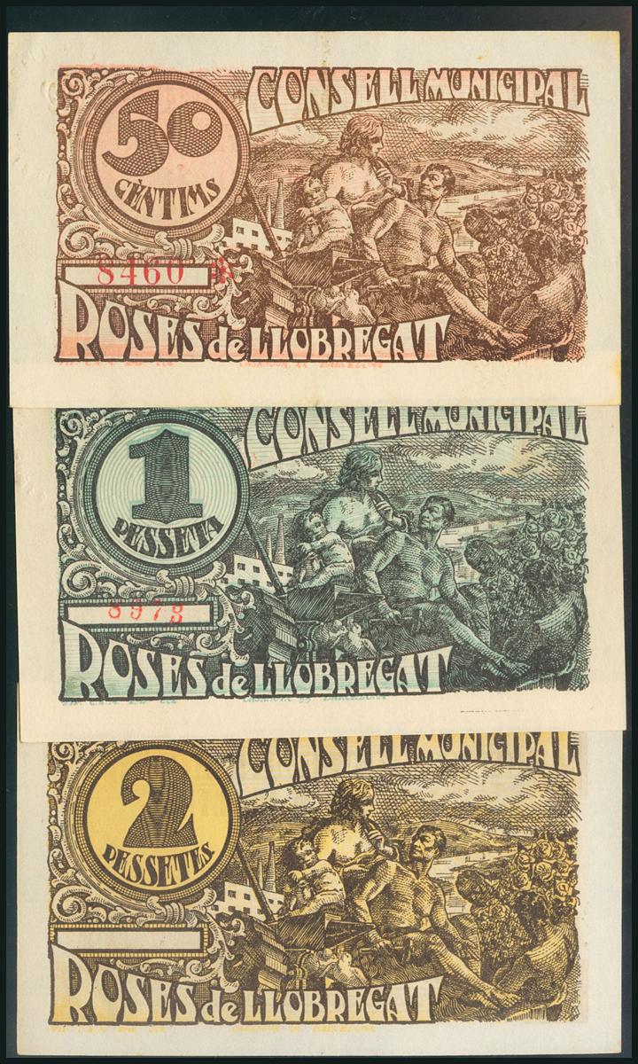 ROSES DE LLOBREGAT (BARCELONA). 50 Céntimos, 1 Peseta y 2 Pesetas. 20 de Mayo de 1937. Series C, B y A, respectivamente. (González: 9752/54). Inusual serie completa, especialmente en esta calidad. EBC/SC.