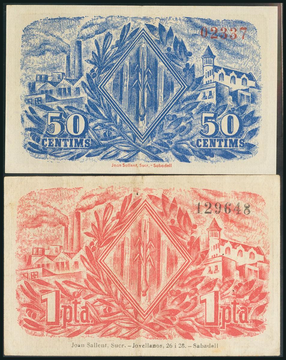 SABADELL (BARCELONA). 50 Céntimos y 1 Peseta. 19 de Mayo de 1937. (González: 9776/77). Serie completa. MBC.
