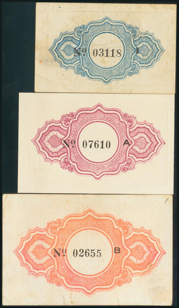 CARAVACA (MURCIA). 25 Céntimos, 50 Céntimos y 1 Peseta. (1938ca). Series I, A y B, respectivamente. (González: 1609/11). Inusual serie completa. MBC/EBC+.