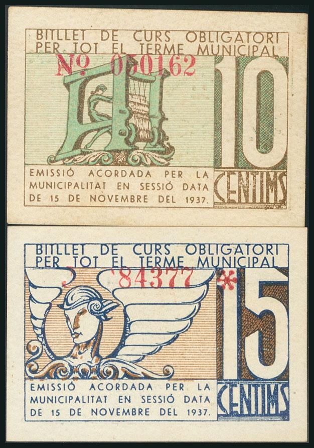 TERRASSA (BARCELONA). 10 Céntimos y 15 Céntimos. 15 de Noviembre de 1937. (González: 10134/35). Serie completa. EBC-/SC.