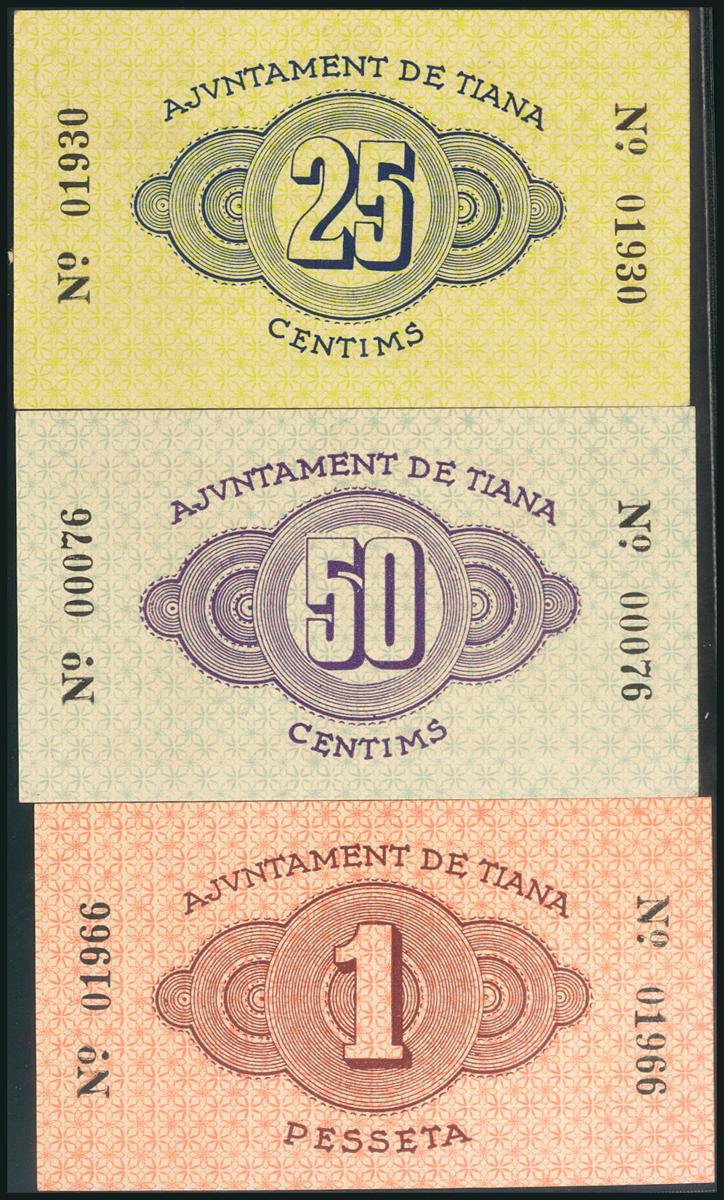 TIANA (BARCELONA). 25 Céntimos, 50 Céntimos y 1 Peseta. 1 de Mayo de 1937. (González: 10257/59). Rara serie completa. EBC+.