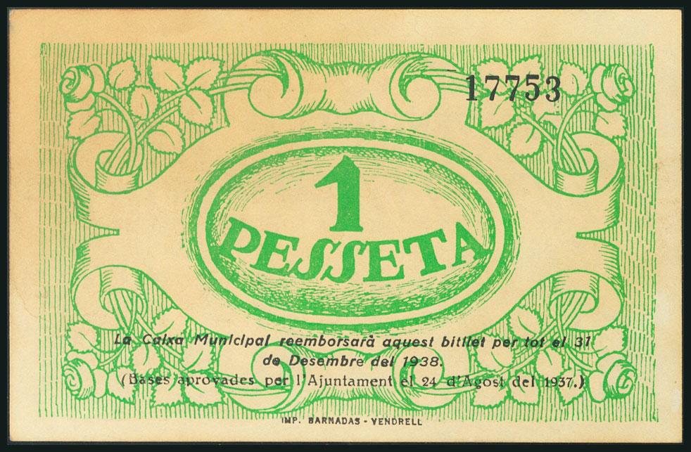 EL VENDRELL (TARRAGONA). 1 Peseta. Agosto 1937. (González: 10600). SC.