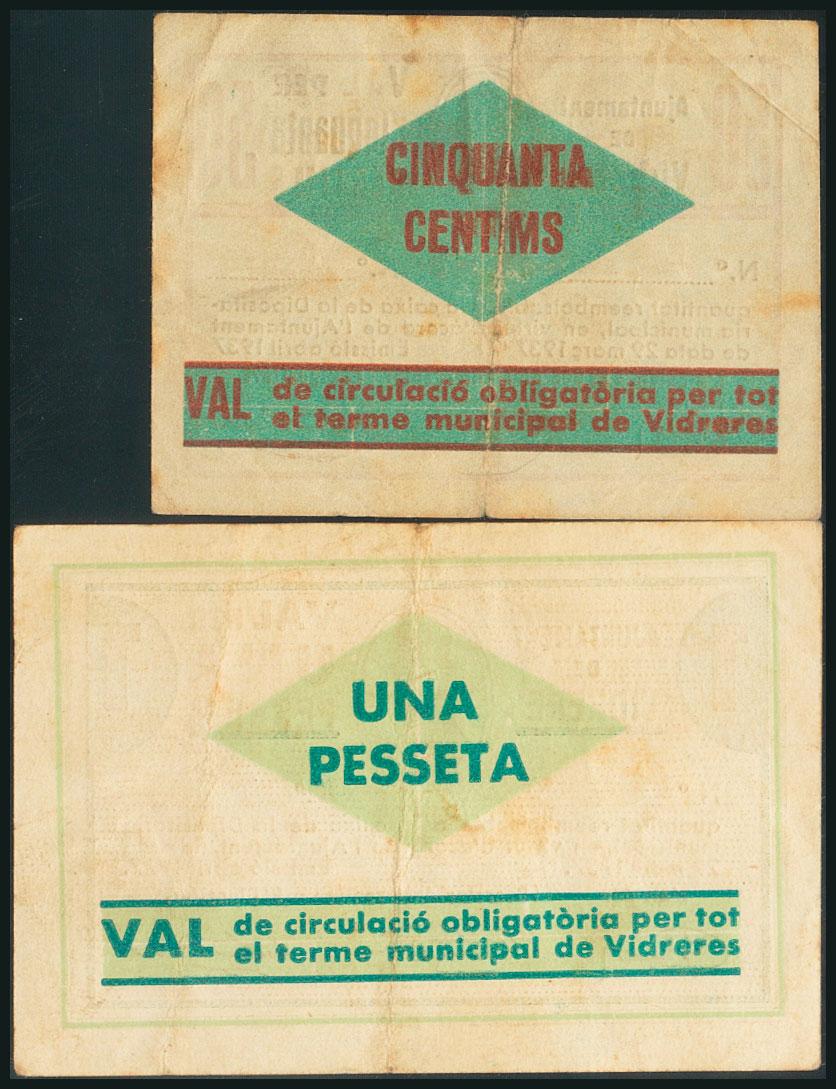 VIDRERES (GERONA). 50 Céntimos y 1 Peseta. Abril 1937. Serie B el 50 cts. (González: 10646/47). Rara serie completa. MBC.