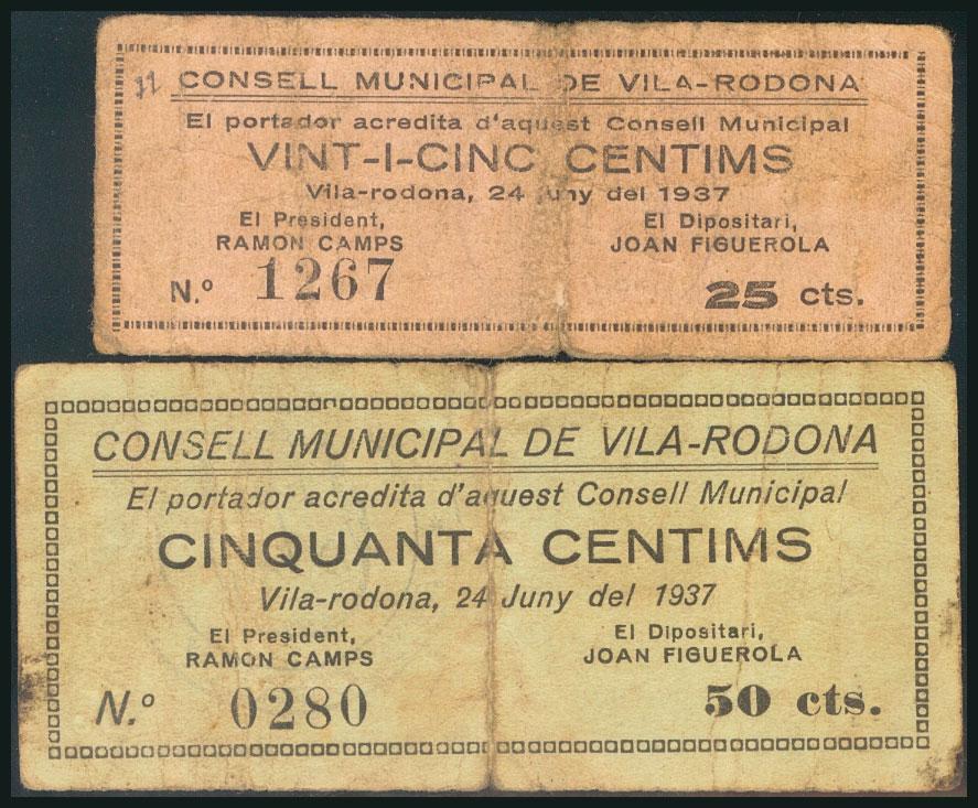 VILA-RODONA (TARRAGONA). 25 Céntimos y 50 Céntimos. 24 de Junio de 1937. (González: 10662/63). Rara serie completa. BC+.