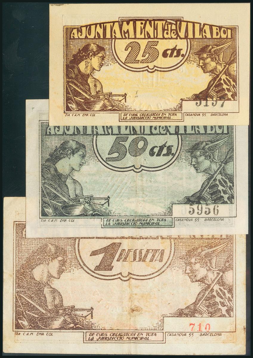 VILABOI (BARCELONA). 25 Céntimos, 50 Céntimos y 1 Peseta. 19 de Mayo de 1937. (González: 10679/81). Inusual serie completa. EBC+/MBC+.