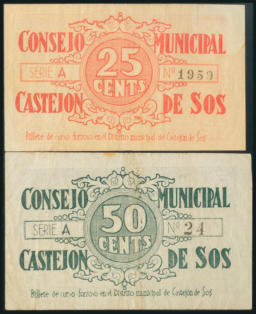 CASTEJON DE SOS (HUESCA). 25 Céntimos y 50 Céntimos. 23 de Noviembre de 1937. Serie A, ambos. (González: 1751, 1752). EBC.