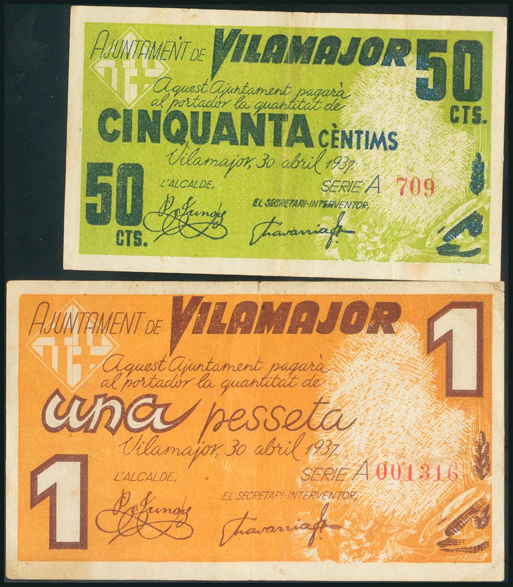 VILAMAJOR (BARCELONA). 50 Céntimos y 1 Peseta. 30 de Abril de 1937. Serie A, ambos. (González: 10766/67). Serie completa. MBC.