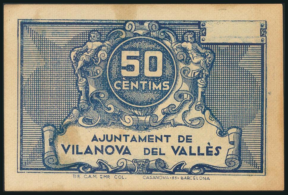 VILANOVA DEL VALLES (BARCELONA). 50 Céntimos. (1938ca). Serie B. (González: 10829). Raro. MBC+.