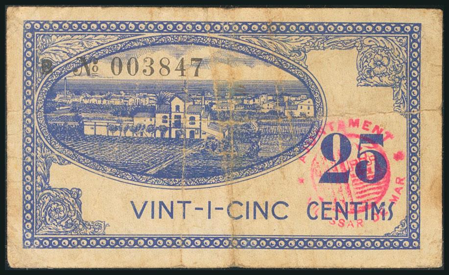 VILASSAR DE MAR (BARCELONA). 25 Céntimos. 10 de Septiembre de 1937. (González: 10868). BC.
