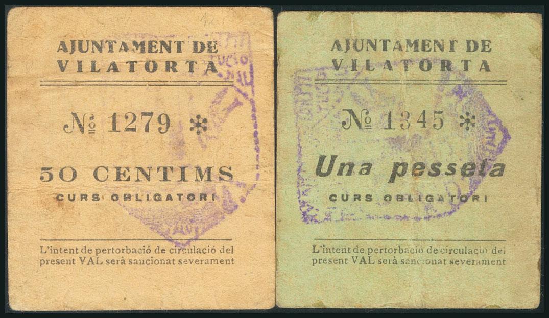 VILATORTA (BARCELONA). 50 Céntimos y 1 Peseta. (1938ca). (González: 10874/75). Muy rara serie completa. MBC.