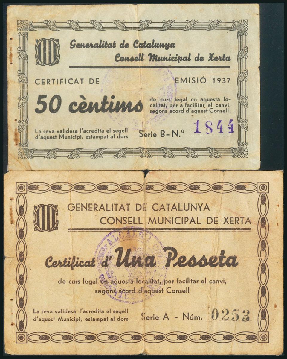 XERTA (TARRAGONA). 50 Céntimos y 1 Peseta. 1937. Series B y A, respectivamente. (González: 10922, 10924). Rarísimos. BC+.