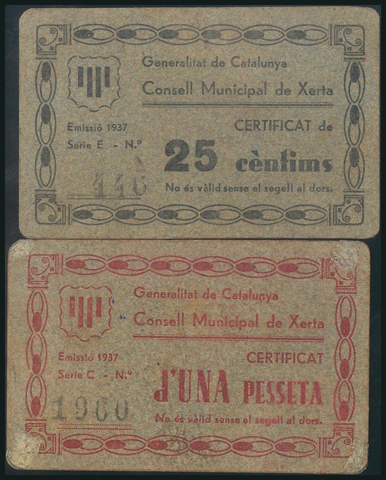 XERTA (TARRAGONA). 25 Céntimos y 1 Peseta. 1937. Series E y C, respectivamente. (González: 10925, 10927). Raros. MBC.