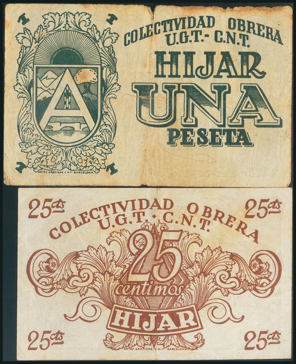 HIJAR (TERUEL). 25 Céntimos y 1 Peseta. (1938ca). (González: 2849/50). Inusual serie completa. MBC/RC.