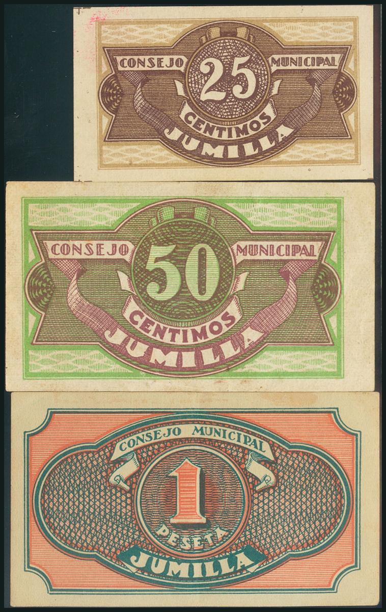 JUMILLA (MURCIA). 25 Céntimos, 50 Céntimos y 1 Peseta. 25 de Febrero de 1937. (González: 3070/72). Inusual serie completa. EBC.
