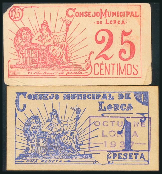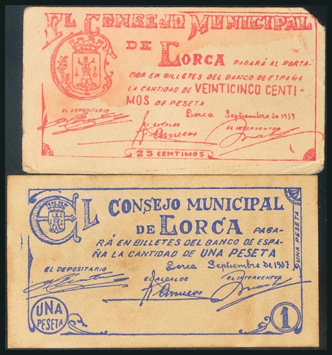 LORCA (MURCIA). 25 Céntimos y 1 Peseta. Septiembre 1937. (González: 3231, 3232d). MBC/EBC.
