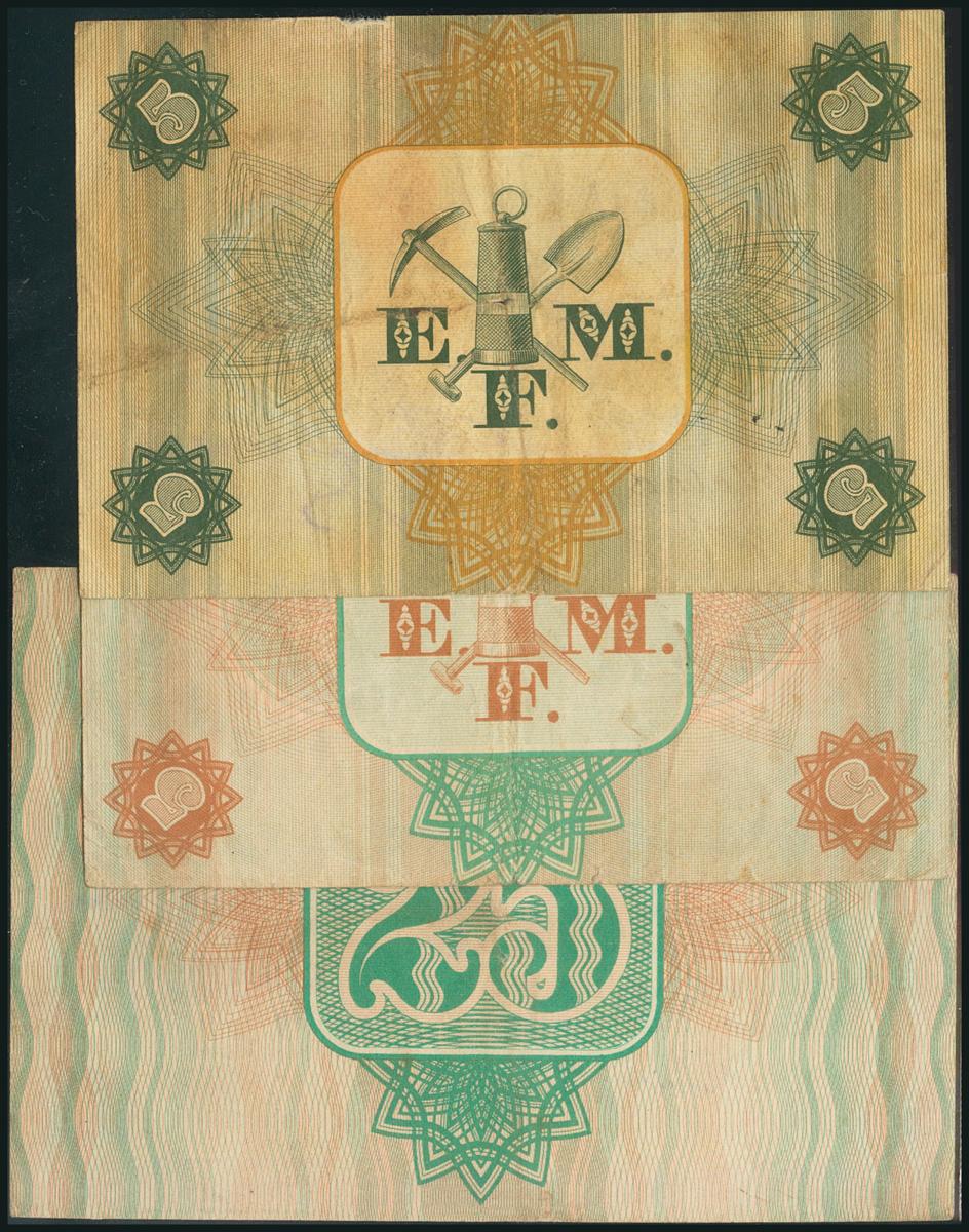 MIERES (ASTURIAS). 5 Pesetas (2) y 25 Pesetas. (1937ca). Series A, B y B, respectivamente. (González: 3519, 3521, 3522). Rarísimos. MBC+.