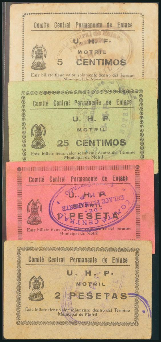 MOTRIL (GRANADA). 5 Céntimos, 25 Céntimos, 1 Peseta y 2 Pesetas. 1937. (González: 3742, 3743, 3746, 3747). Muy raro conjunto. MBC/MBC+.