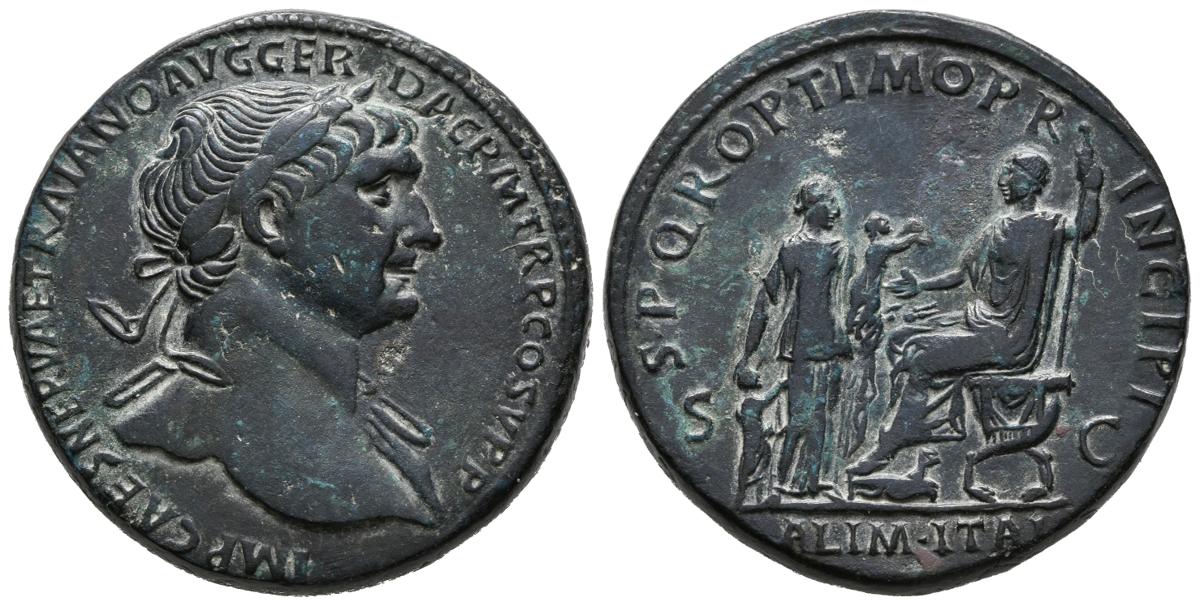 TRAJANO. Sestercio. (Ae. 23,24g/31mm). 103-111 d.C. Roma. Anv: IMP CAES NERVAE TRAIANO AVG GER DAC P M TR P COS V P P. Busto laureado con ligero drapeado sobre hombro izquierdo a derecha de Trajano. Rev: SPQR OPTIMO PRINCIPI. Abundancia entregando niño, con otro detrás, a Trajano sentado a izquierda portando lanza, en exergo ALIM ITAL. (RIC 461). MBC+. Retocado. Escaso.
