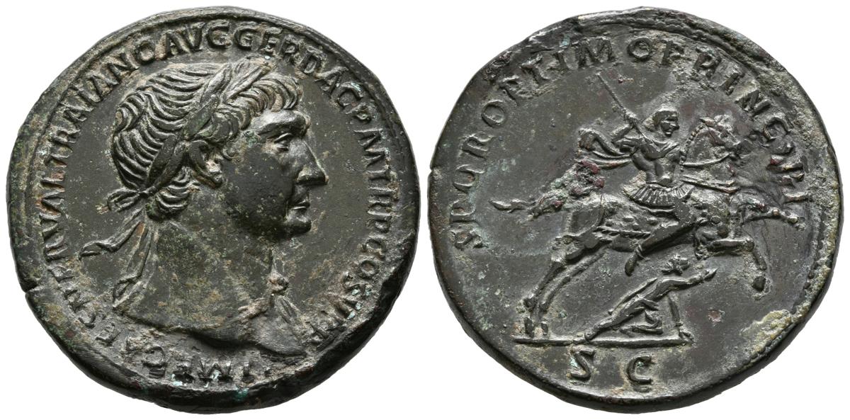 TRAJANO. Sestercio. (Ae. 23,25g/34mm). 104/5-107 d.C. Roma. Anv: IMP CAES NERVAE TRAIANO AVG GER DAC P M TR P COS V P P. Busto laureado con ligero drapeado sobre hombro izquierdo a derecha de Trajano. Rev: S P Q R OPTIMO PRINCIPI. Trajano con atuendo militar portando lanza sobre caballo a derecha sobre Dacia. (RIC 534 var). EBC-. Precioso y raro ejemplar así.
