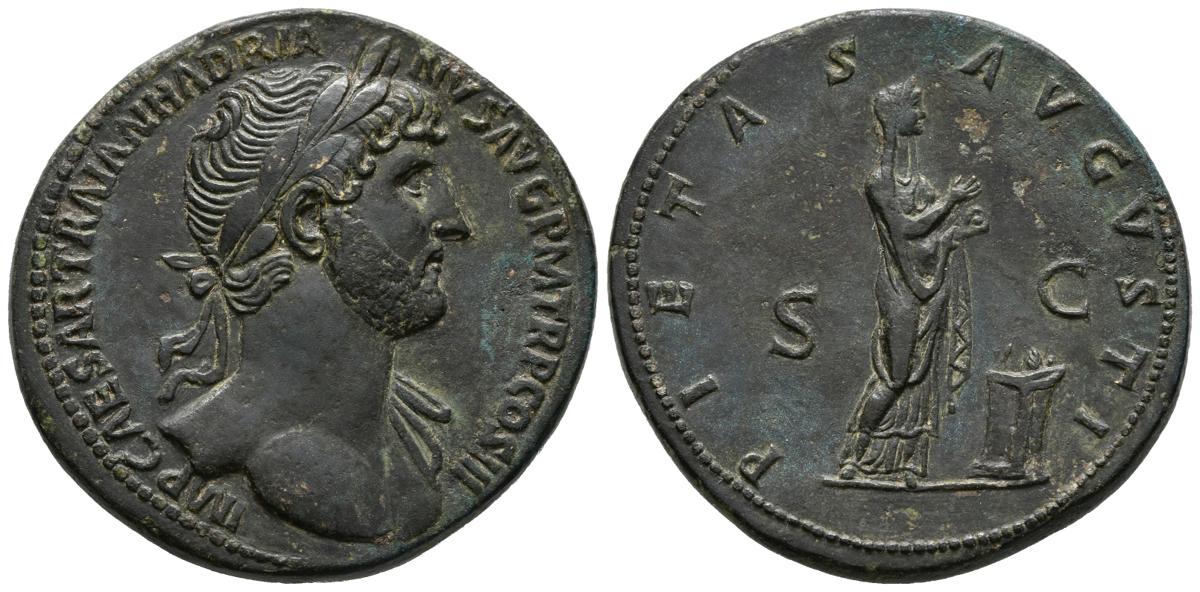 ADRIANO. Sestercio. (Ae. 23,65g/34mm). 124 d.C. Roma. Anv: IMP CAESAR TRAIAN HADRIANVS AVG P M TR P COS III. Busto laureado con ligero drapeado en hombro izquierdo a derecha. Rev: PIETAS AVGVSTI. Pietas estante a derecha sosteniendo incienso sobre altar, entre S-C. (RIC 587a). EBC-. Retocado.