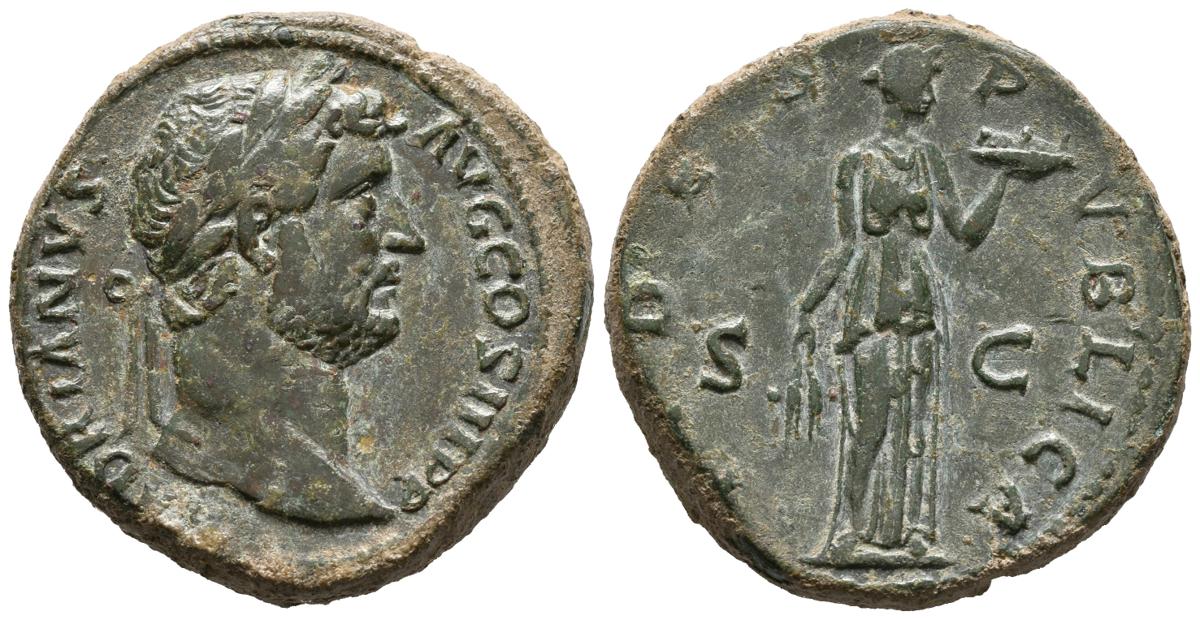 ADRIANO. Sestercio. (Ae. 27,22g/31mm). 134-138 d.C. Roma. Anv: HADRIANVS AVG COS III P P. Busto laureado a derecha de Adriano. Rev: FIDES PVBLICA. Fides estante a derecha portando cesto de frutas y espigas, entre S-C. (RIC 758). MBC+. Escasa en esta calidad