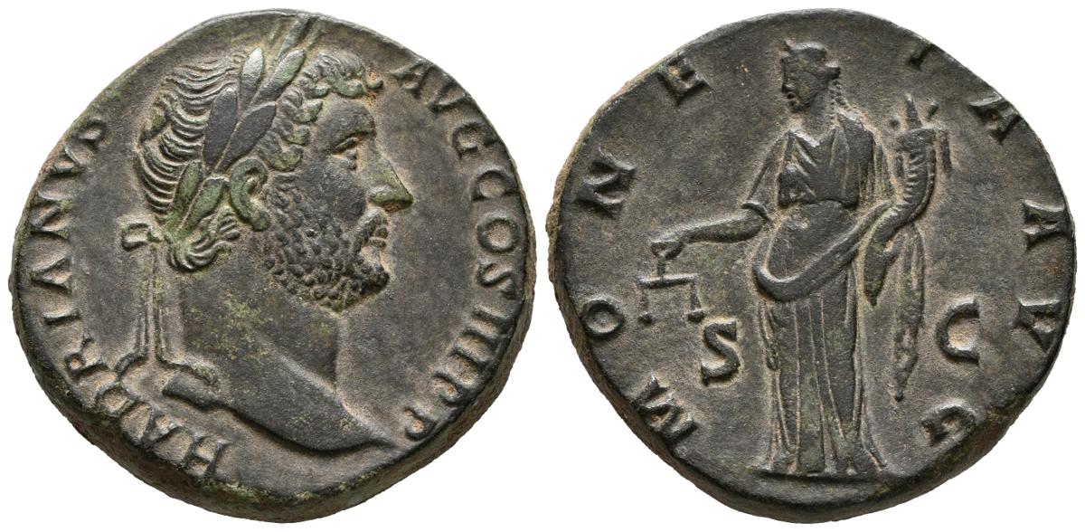 ADRIANO. Sestercio. (Ae. 23,66g/31mm). 134-138 d.C. Roma. Anv: HADRIANVS AVG COS III P P. Busto laureado a derecha de Adriano. Rev: MONETA AVG. Moneta estante a izquierda portando cornucopia y escalas, entre S-C. (RIC 767). EBC-. Retocado.
